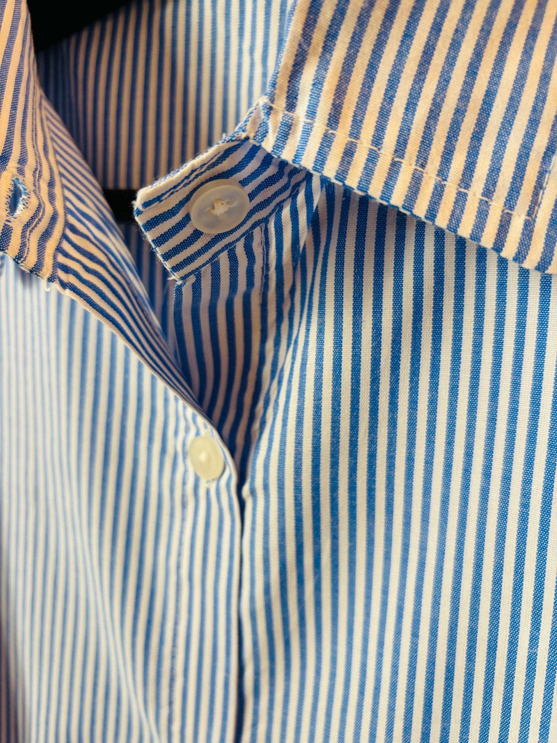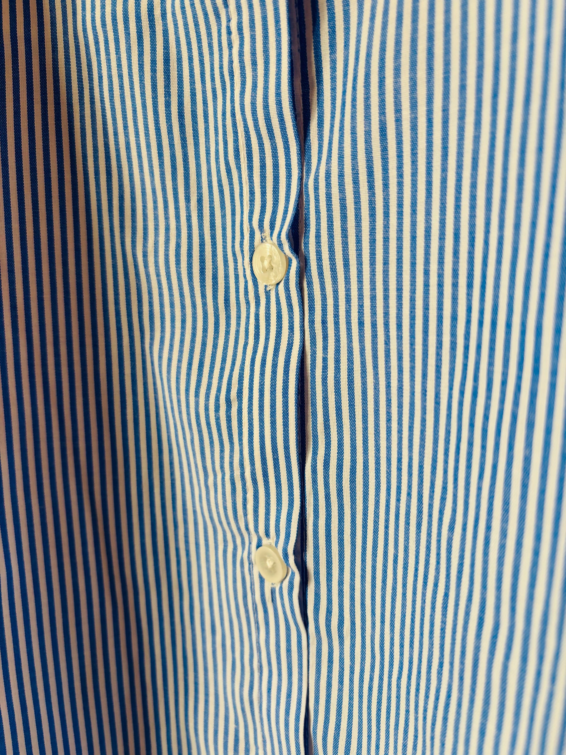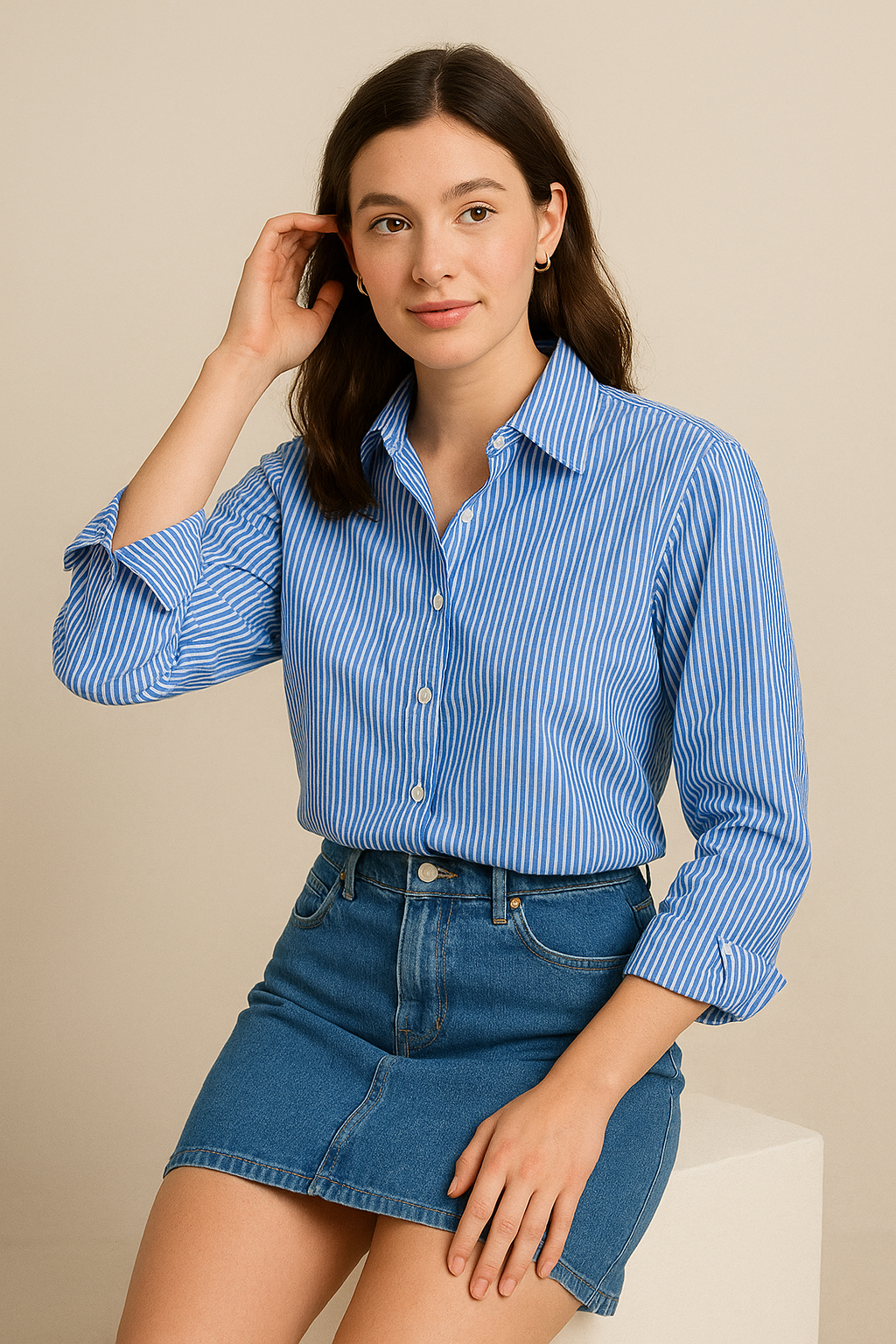 Elevate your casual wardrobe with this refreshing blue striped shirt. Crafted from soft, breathable cotton, its timeless vertical stripes and structured collar make it a staple for any season. A subtle nod to coastal cool, this piece transitions seamlessly from weekday meetings to weekend getaways.