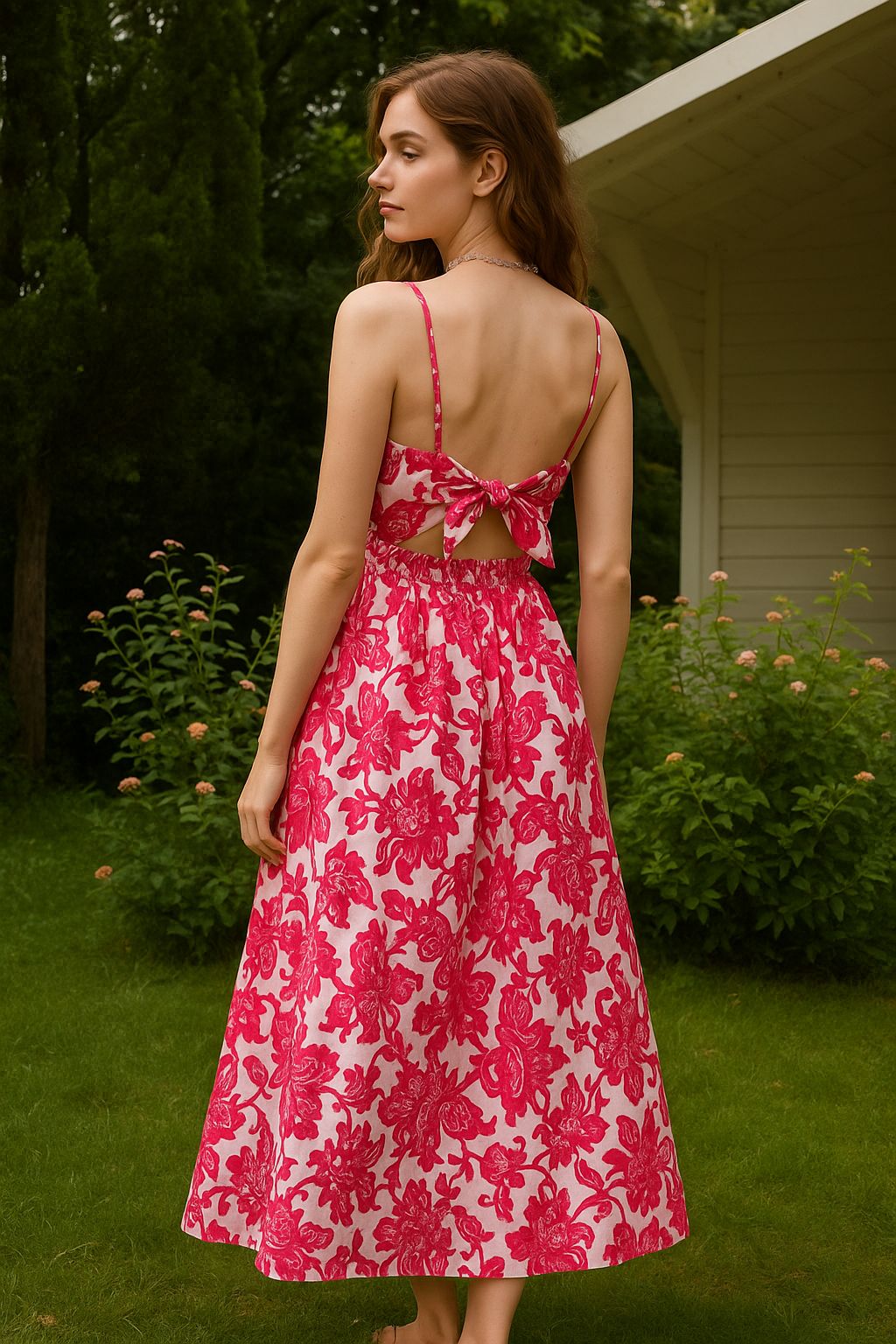 Crafted in a lightweight cotton, this dress features a soft scoop neckline, a dainty bow-tie back, and a flowy A-line silhouette that flatters every body. The elasticated waist hugs you just right, while the floral print brings pure joy to your wardrobe. Whether you're heading to a weekend getaway, picnic, or just romanticizing your walk to the café — it’s giving cottagecore princess, soft summer glow, and effortless main character energy.