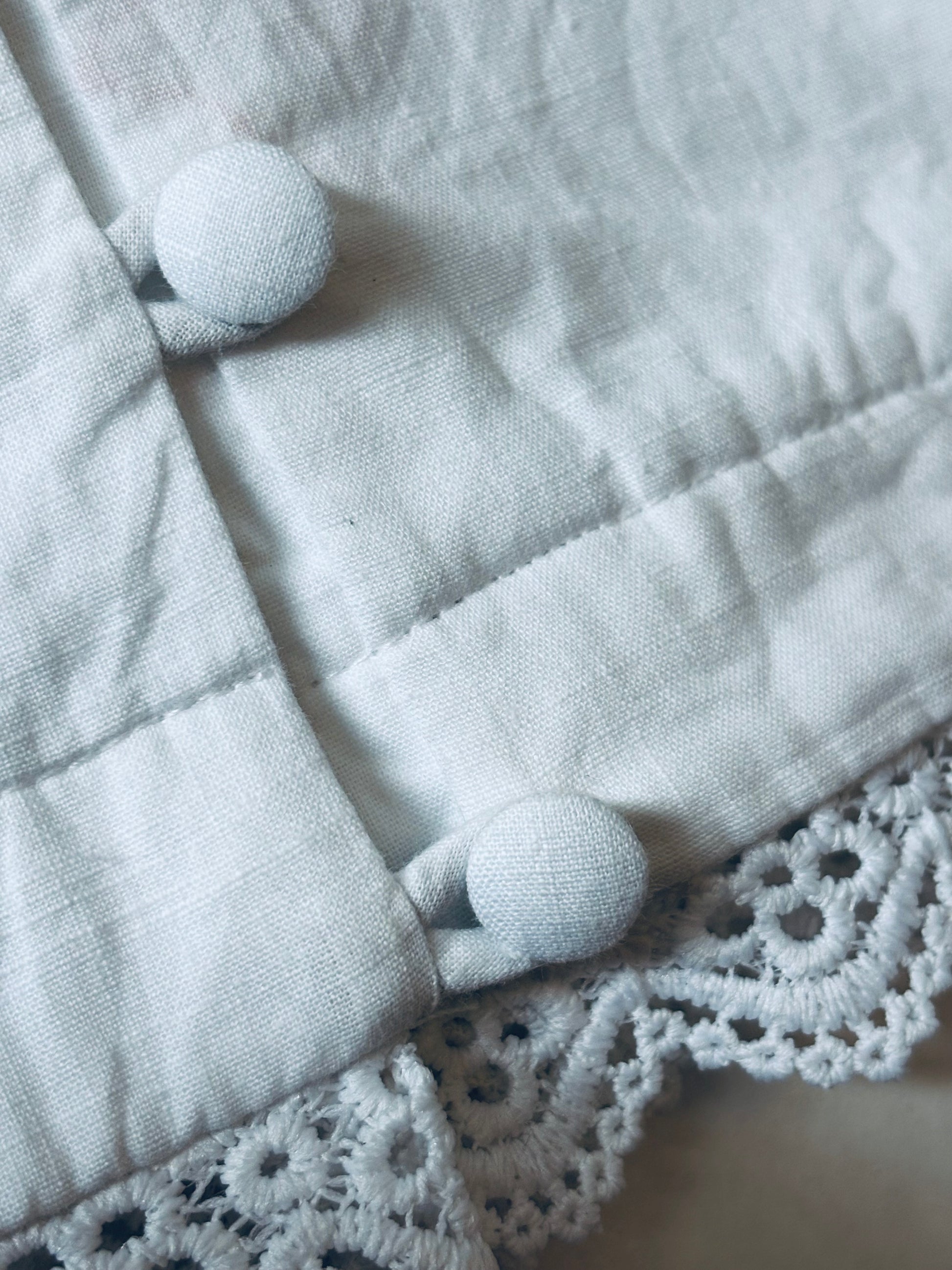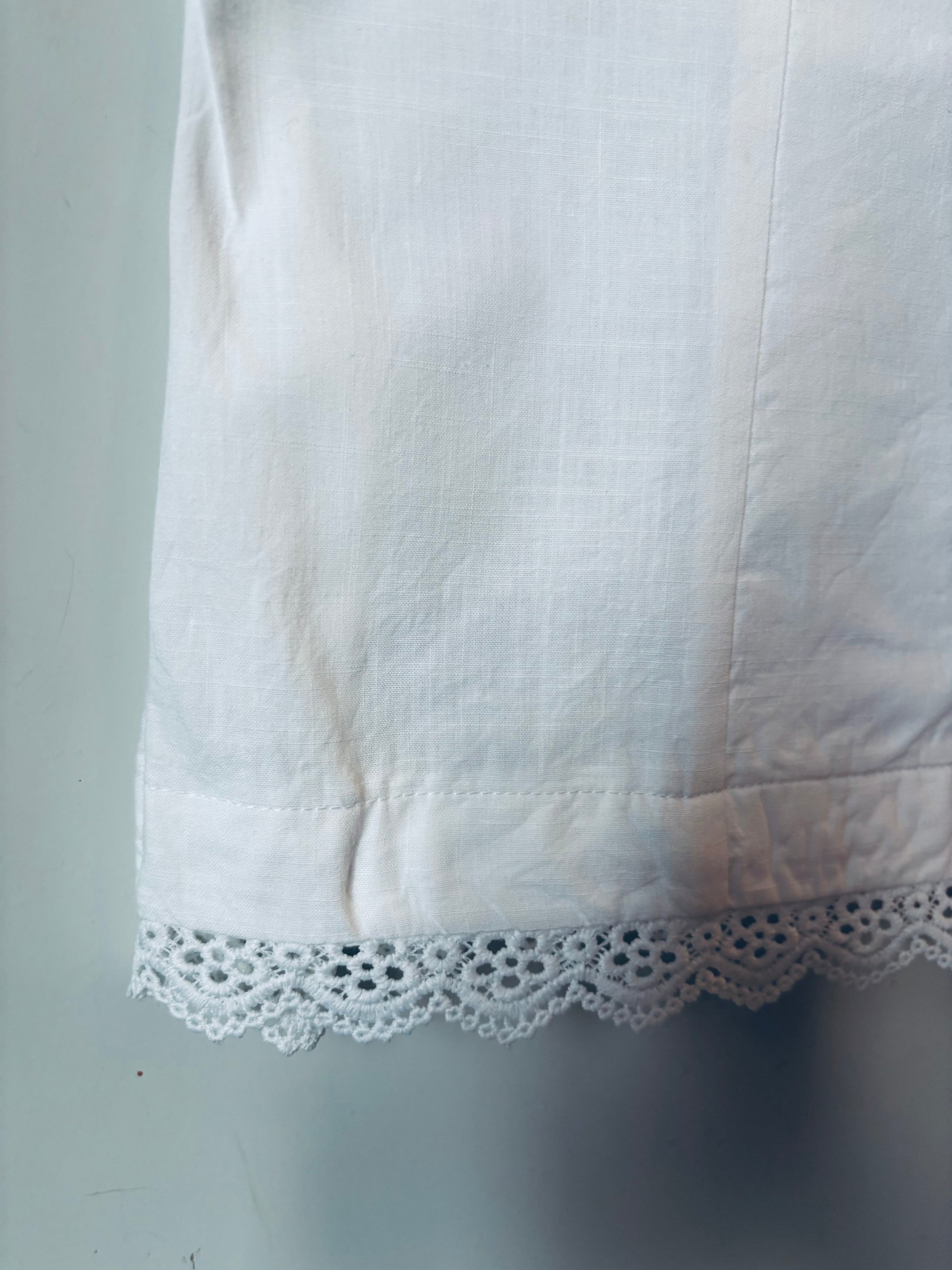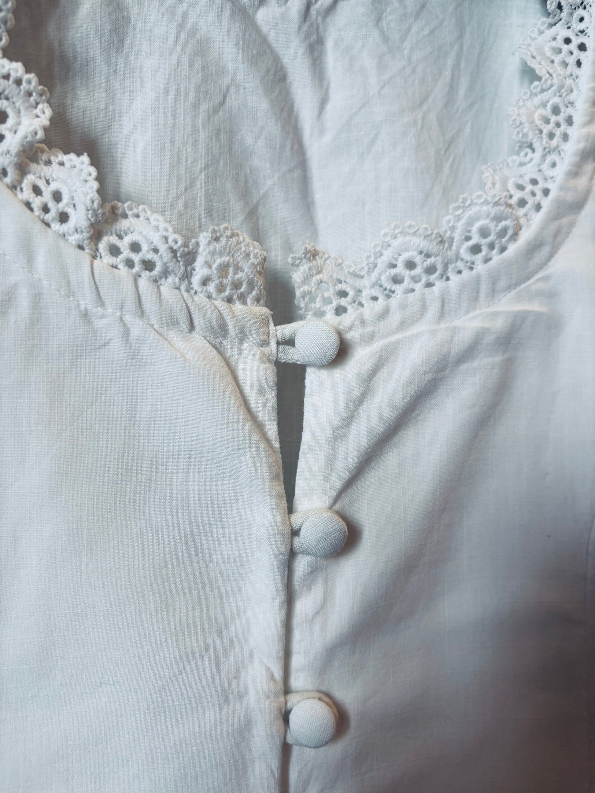 Turn heads with this elegant yet casual white top, crafted from 100% breathable cotton. Featuring a U-neckline, delicate lace detailing, and a flattering fitted silhouette, this piece is perfect for warm days or stylish layering. Fabric-covered buttons add a romantic charm that pairs beautifully with high-rise jeans or skirts.